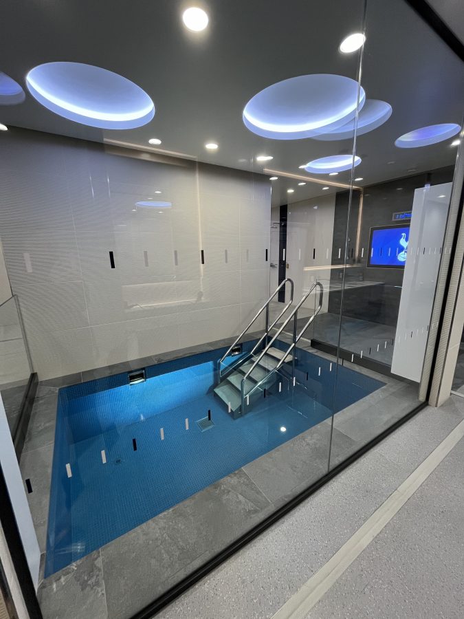 In der Umkleidekabine der Heimmannschaft gibt es auch ein Eisbad. Jeder Spieler muss nach dem Spiel ins Eisbad, spätestens 15 Minuten danach. Mindestens 8 Minuten sollten sie drin bleiben, aber nicht alle machen das 😜 Manche versuchen, nur 4 Minuten auszuhalten. Ein Eisbad ist wichtig für die Erholung. Während des Spiels entstehen kleine Muskelschäden. Das ist nicht schlimm, kann aber zu Steifheit führen. Ein Eisbad hilft, kleine Entzündungen zu verhindern, sodass sich die Spieler schneller erholen. Nach dem Eisbad gibt’s dann eine warme Dusche 🙂