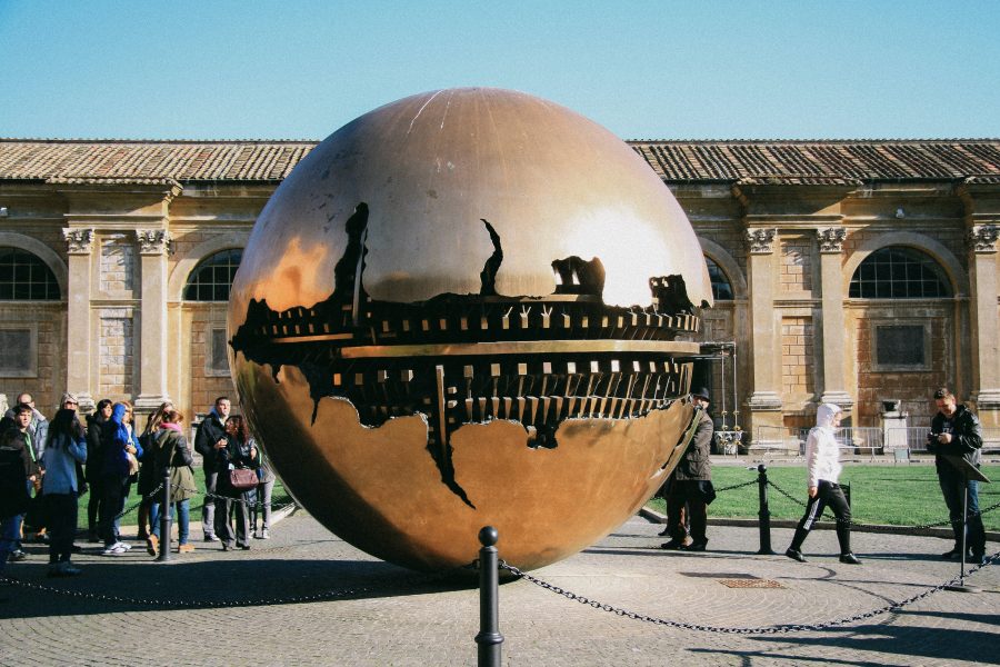 Obwohl der große Tannenzapfen eigentlich der Blickfang des Innenhofs sein sollte, wird die Aufmerksamkeit heutzutage vollständig von einer auffälligen, sich drehenden Bronzekugel abgelenkt. Diese Kugel heißt Sfera con Sfera. Das bedeutet ‚Kugel in einer Kugel‘. Die äußere Schicht scheint zu platzen, wodurch eine innere Kugel sichtbar wird. Die Idee hinter der Skulptur ist es, ein Gefühl von Instabilität und Unsicherheit zu schaffen, wobei die eine Kugel innerhalb der anderen enthüllt wird. Diese Kugel ist an mehreren Orten auf der Welt zu finden. Jede Version hat ihre eigene Interpretation, aber sie symbolisieren oft Themen wie das Universum, Zeit, Kraft und die Zerbrechlichkeit der menschlichen Natur.