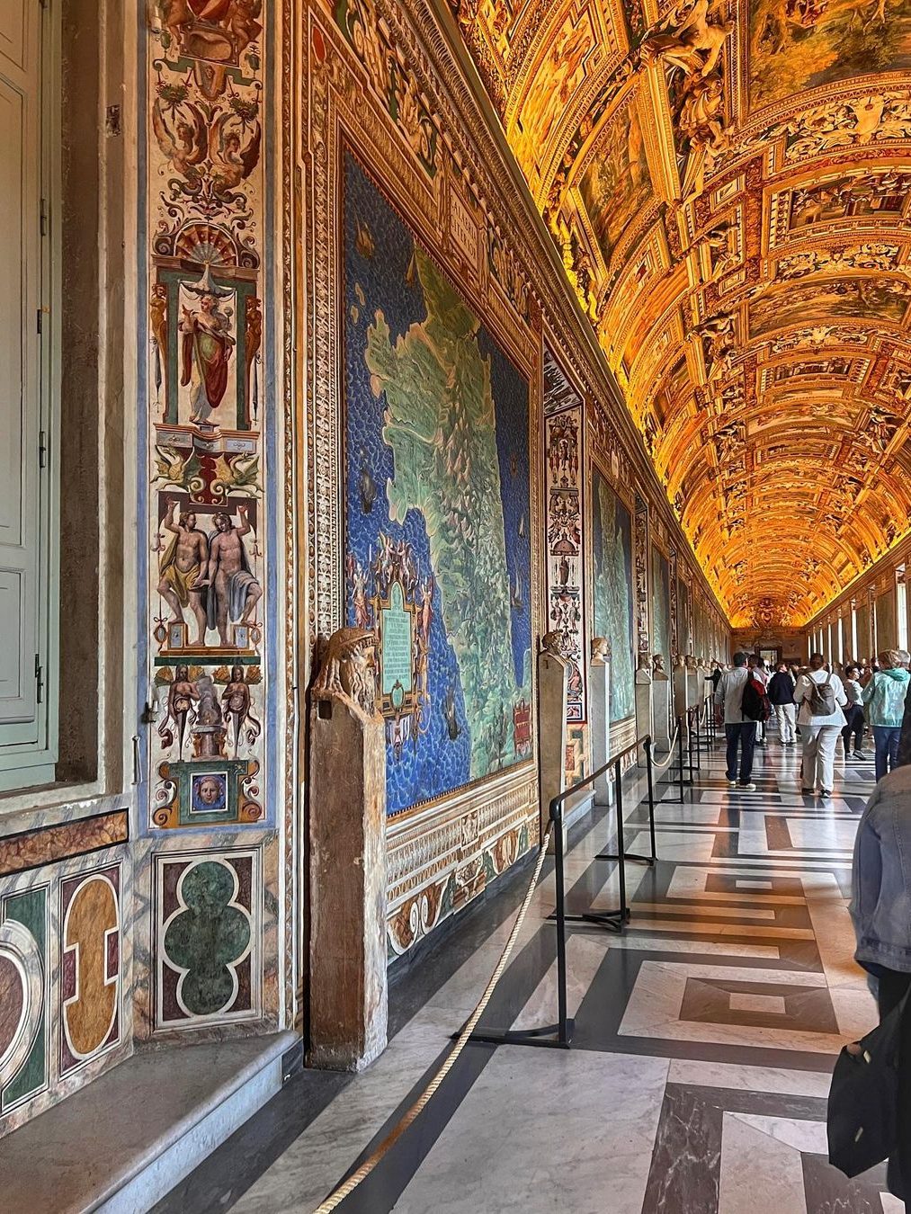 Die Kartengalerie befindet sich im obersten Stockwerk der Vatikanischen Museen. Sie ist ein wahrer künstlerischer Schatz, der darauf wartet, entdeckt zu werden. Dieser lange, ausgedehnte Gang ist mit einer Sammlung großer Fresken geschmückt, die detaillierte Karten und Landschaften von u.a. Italien zeigen. Diese Galerie ist eine Hommage an die Kartografie und das geografische Wissen jener Zeit. So unternimmt man in relativ kurzer Zeit eine Reise durch die Geschichte der Entdeckungsreisen und der dazugehörigen, gezeichneten Karten.