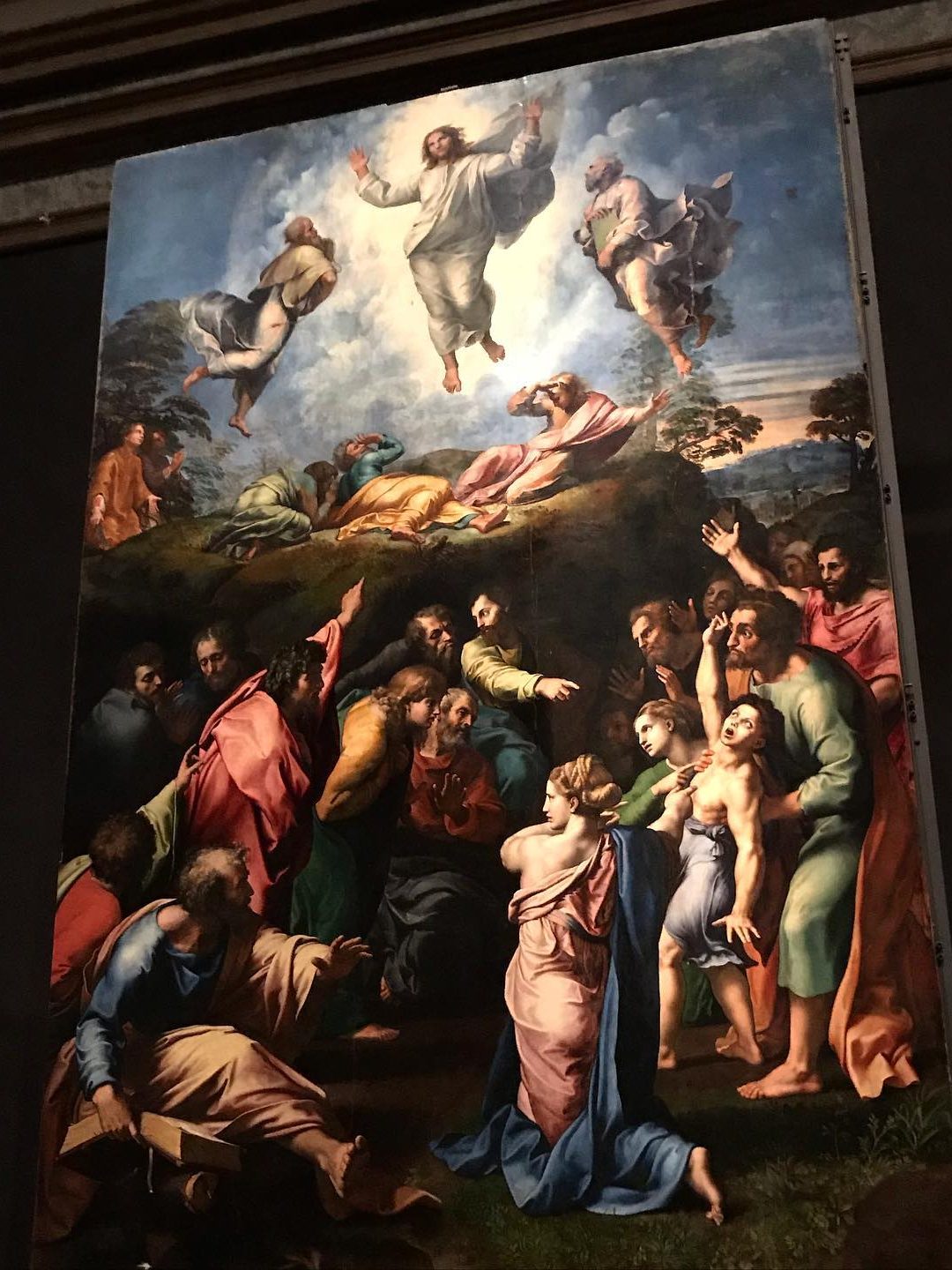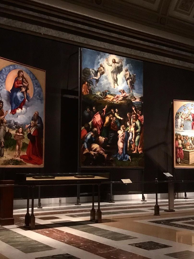 Saal VIII: mit Wandteppichen, die früher in der Sixtinischen Kapelle hingen, und Werken von Raphael. Besonders das Werk ‚Madonna von Foligno‘ ist sehenswert. Und das Werk ‚Verklärung Christi‘. Dies wird als eines der Meisterwerke von Raphael angesehen. Diese beiden Kunstwerke hängen nebeneinander in den Vatikanischen Museen (siehe unten auf dem Foto).