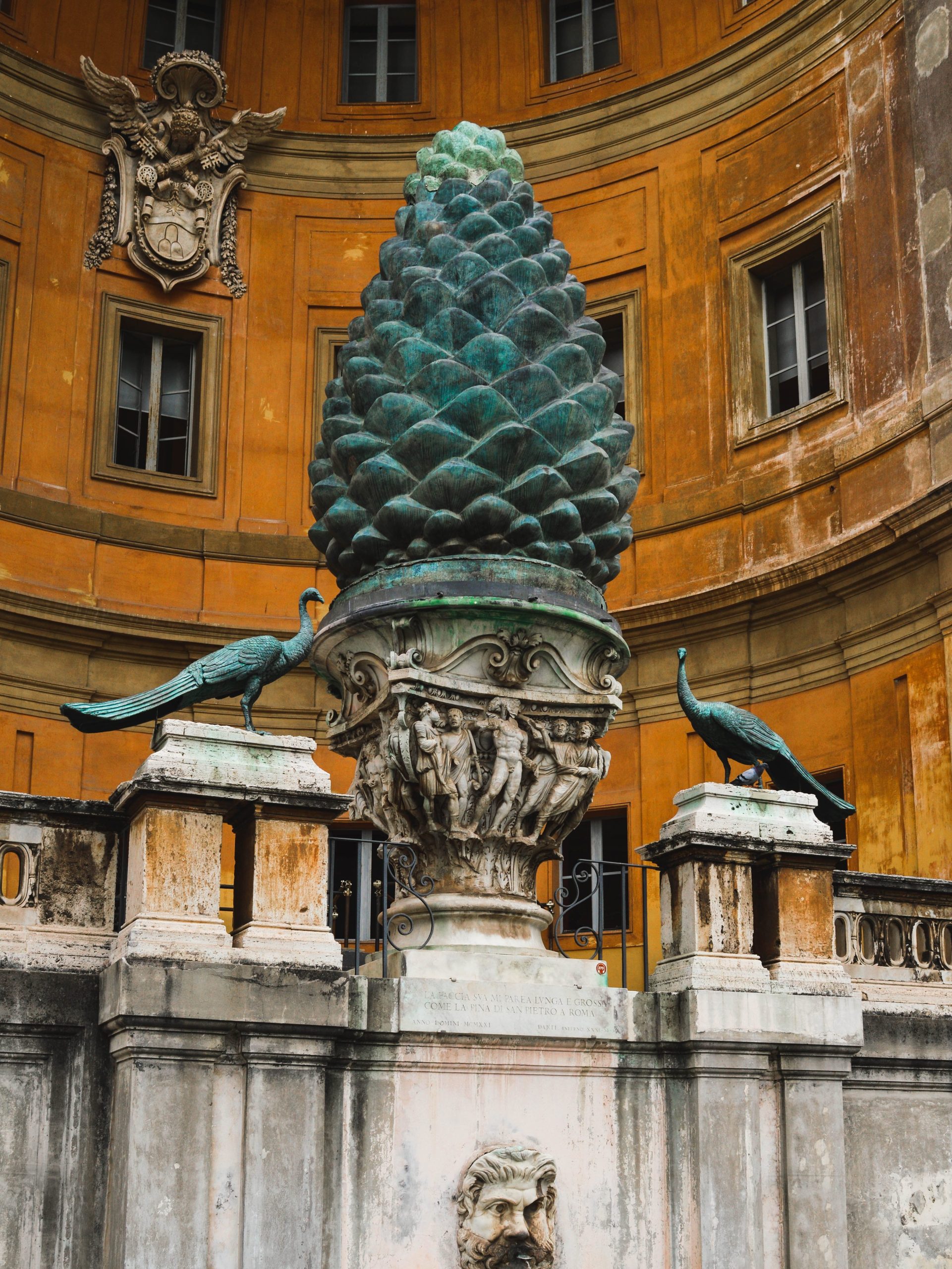 Vergessen Sie während Ihres Besuchs nicht, einen Zwischenstopp im Innenhof einzulegen. Der Innenhof trägt den Namen Cortile della Pigna. Das bedeutet Innenhof mit Tannenzapfen. Der Innenhof verdankt seinen Namen einem riesigen, fast 4 Meter langen bronzenen Tannenzapfen, der über der Treppe platziert ist. Neben dem Tannenzapfen stehen 2 Pfauen. Davor sehen Sie noch 2 Basaltlöwen (die auf dem Foto unten nicht zu sehen sind).